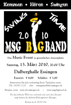 Kommen Sie am 13. März 2010 in die Essinger Dalberghalle, Hören Sie ein buntes Musik-Programm der MSG Big Band und Swingen Sie mit!